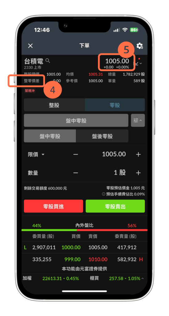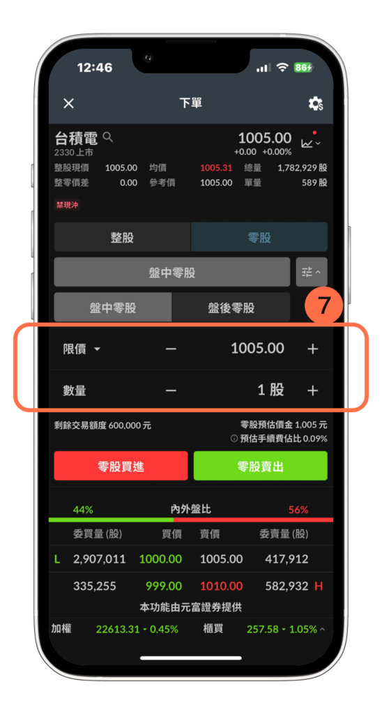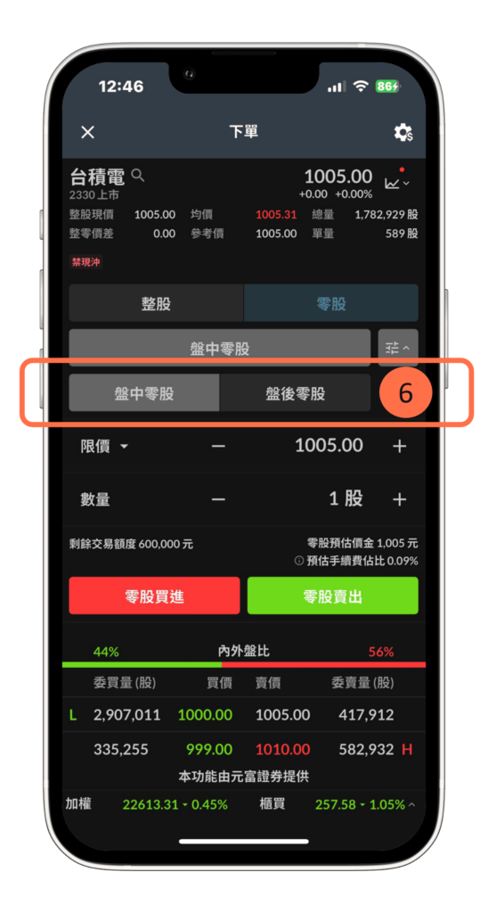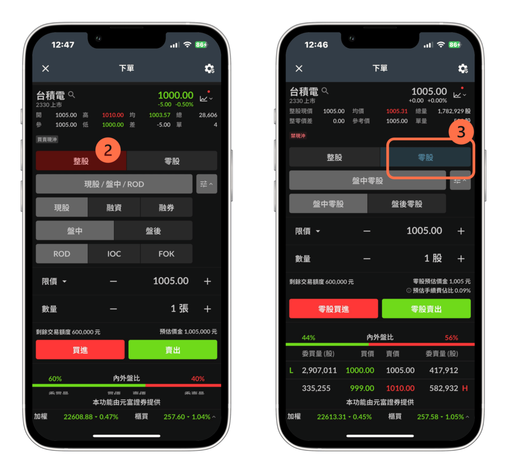 - 點選切換至 3 號指標位置,可進行零股交易(數量顯示:股)。
