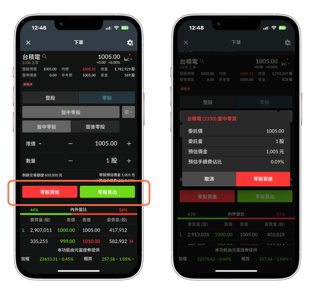 確認委託單內容沒問題後即可點選零股買入 / 零股賣出來送出委託單。