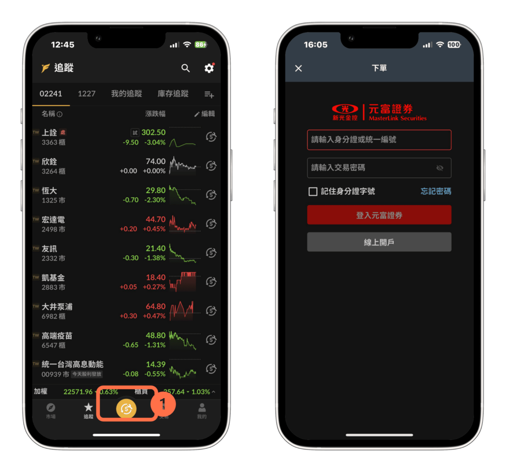 點選富果 App 的「下單」頁面,登入富果合作券商的證券戶帳號