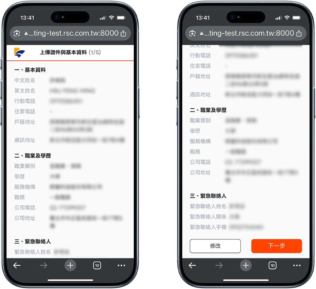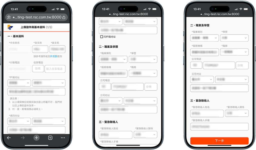 輸入職業類別、服務單位、職稱,以及緊急聯絡人資料。