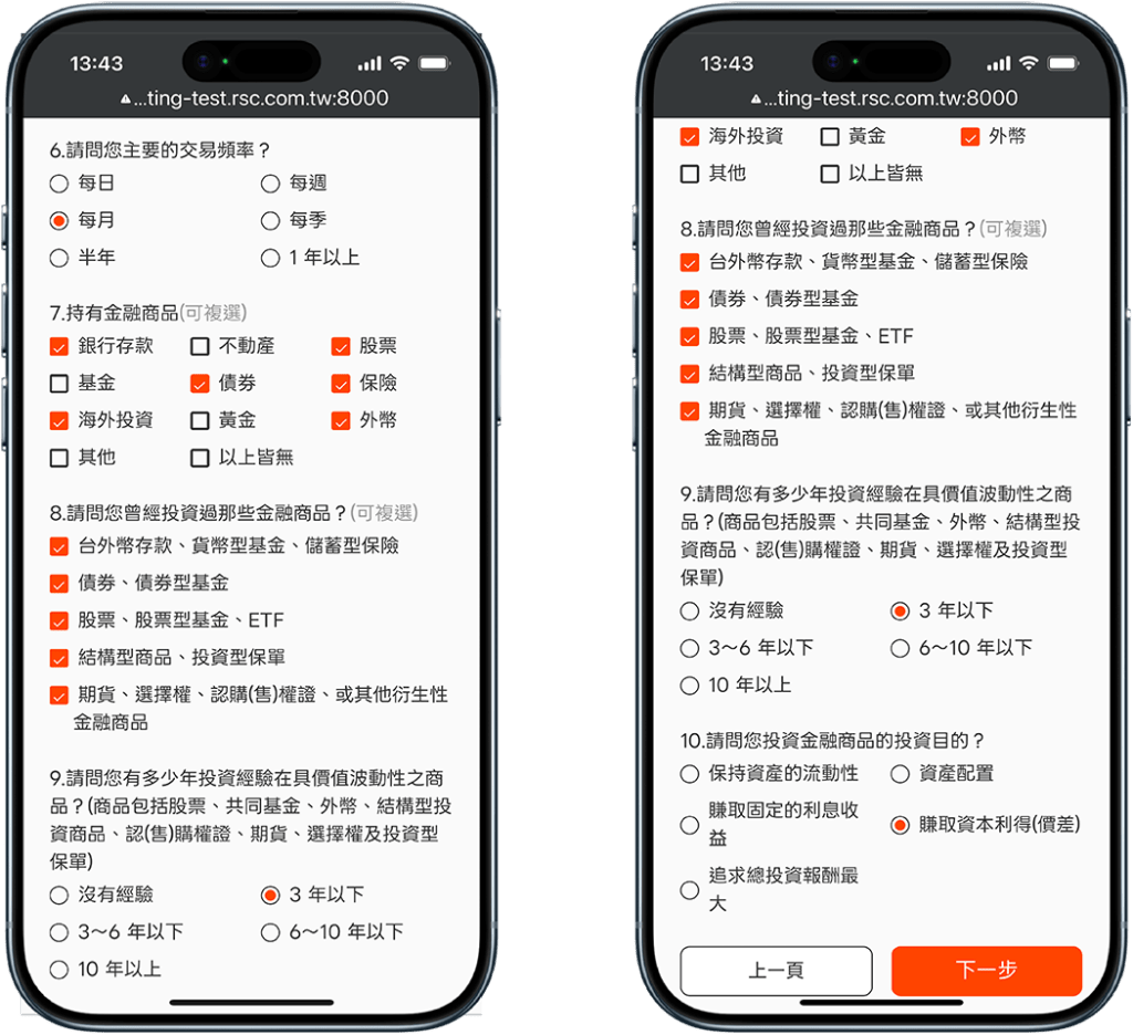 問卷內容包含財務狀況、投資經驗、投資目標與風險承受度。